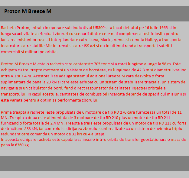 Primul zbor spatial din 2013http://www.spacealliance.ro/articles/view.aspx?id=20130115115408Satelitii Molnyia erau lansati in orbite eliptice inalte pe cand Raduga operau in orbite geostationare completand acoperirea globala de care avea nevoie armata rusa.