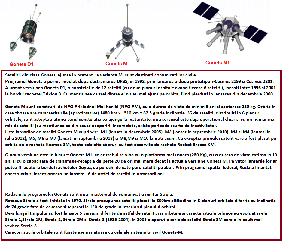 Rusia a lansat pe 3 iulie un nou trio de sateliti de comunicatie din clasa Gonets M. Cei trei se numesc Gonets M 8, 9 si 10, iar plasarea lor pe orbita vine la mai putin de un an de la precedent lansare de acest fel (septembrie 2013) care i-a avut in prim plan pe Gonets M 5,6 si 7.