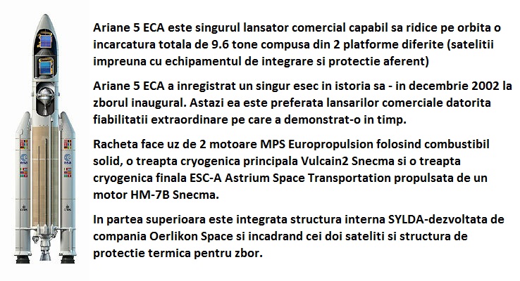 Operat joi 16 octombrie de la complexul ELA 3 al bazei spatiale din Kourou, zborul a folosit versiunea ECA, cea mai puternica a lansatorului european. Ariane 5 are trei variante constructive: ES, GS si ECA.