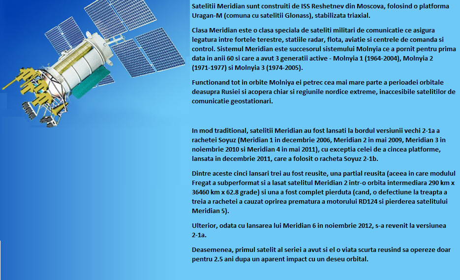 Rusia a lansat pe 30 octombrie cel de al saptelea satelit de telecomunicatii militare Meridian. La ora 01:43 UTC, o racheta Soyuz 2 1A se desprindea de rampa de lansare a bazei spatiale din Plesetsk si dupa ceva mai mult de doua ore de zbor si 3 manevre ale modulului de propulsie Fregat, transfera cu succes intr-o orbita cu caracteristicile 978.4 x 39724.9 km x 62.84 grade inclinatie, satelitul Meridian 7.