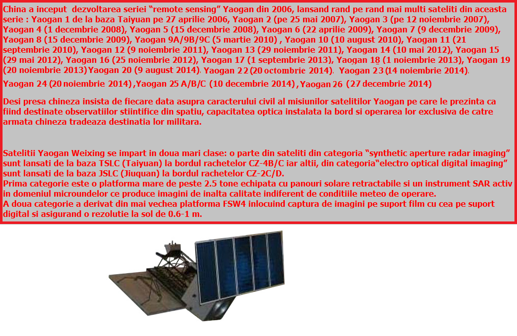 Trebuie sa mai adaugam ca Yaogan 27 este un satelit de dimensiuni medii, platforma sa, construita de China Aerospace Science and Technology Corporation cantarind in jur de o tona.