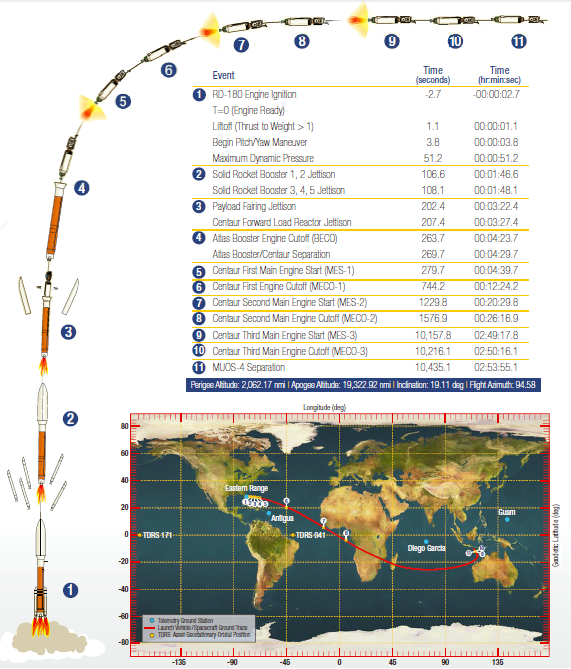 Muos 4 este un satelit masiv, doar un pic mai mic decat predecesorul sau Muos 3, lansat in ianuarie, astfel ca a fost nevoie de versiunea 551 a lui Atlas 5 pentru a il transfera pe orbita. Chiar si asa, dupa un zbor de aproape 3 ore, ce a inclus 3 activari a treptei superioare Centaur, Muos 4 nu a putut fi injectat direct intr-o traiectorie GEO ci doar intr-una GTO (orbita de transfer geostationara) 3819 km x 35784 km x 19.11 grade inclinatie. Propulsia de la bord va realiza restul manevrelor orbitale: circularizarea traiectoriei, scaderea inclinatiei si mutarea la slotul orbital dorit. Aceasta a fost a sasea lansare a versiunii 551 a lui Atlas 5 (folosita in trecut de misiunile interplanetare New Horizons si Juno si de misiunile militare Muos 1, Muos 2 si Muos 3) si a 56-a pentru Atlas 5.