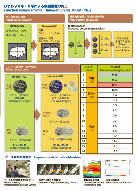 Acestea sunt cifre mult superioare generatiei anterioare de sateliti MTSat pe care i-a avut Japonia pana acum (acestia nu aveau decat 5 benzi de observatie -1 in spectru vizibil si 4 in infrarosu, un disc complet al Pamantului era acoperit in 30 de minute, in timp ce rezolutia era de 1 km in spectrul vizibil si respectiv 4 km in infrarosu).
