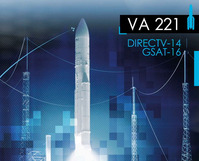 Sambata 6 decembrie, Arianespace a realizat o noua lansare cu ajutorul rachetei de clasa mare Ariane 5. Zborul, cu indicativul VA 221, a folosit versiunea cea mai puternica a lui Ariane 5, respectiv ECA, iar pasagerii s-au numit DirecTV 14 si GSat 16.