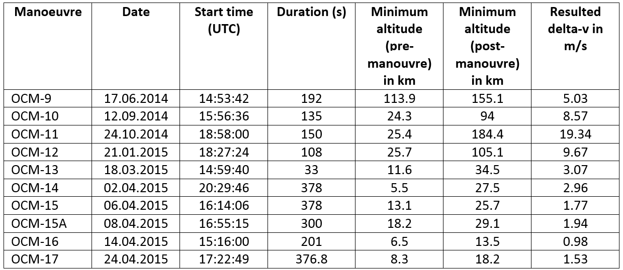 Pe parcursul lui 2014 si in primele luni ale lui 2015, de fiecare data cand altitudinea minima a orbitei a scazut, inginerii de la centrul de control au comandat manevre orbitale (asa numitele OCM sau Orbit Correction Maneuvers) pentru a evita impactul cu suprafata planetei Mercur.