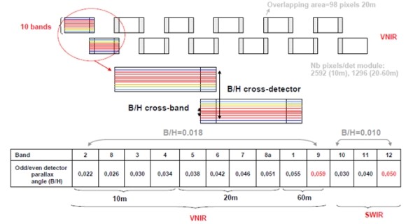 Detectorii sunt de tip CMOS pentru observatii VNIR (large visible near-infrared) si respectiv ‘mercury-cadmium-telluride detectors hybridised on a CMOS read-out circuit’ pentru banda SWIR (shortwave infrared), acestia din urma fiind de asemenea controlati termic si mentinuti sub 195 de grade Kelvin. Insumand toti cei 12 detectori ajungem la un numar de 450.000 de pixeli disponibile pe fiecare banda.