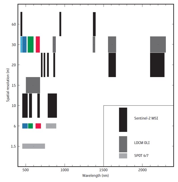 Cum aminteam mai devreme, lungimea de unda pentru fiecare din benzile de observatie a fost aleasa sa completeze masuratorile satelitiilor Spot si Landsat.