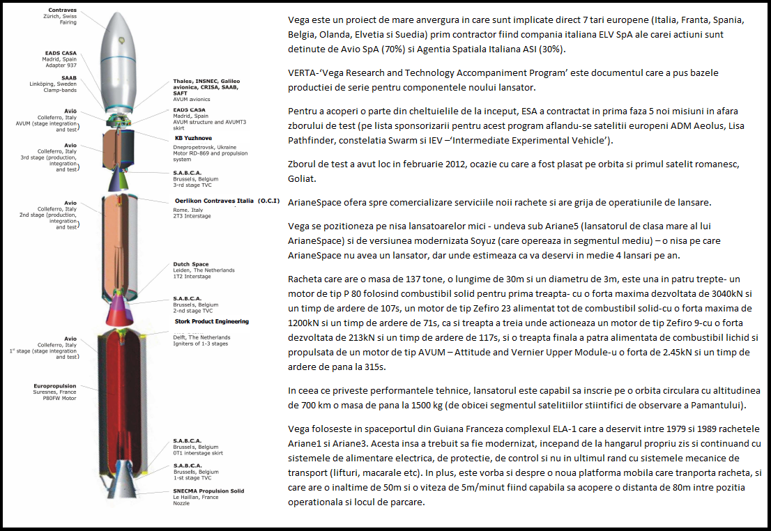 Reamintim ca in 2012, in zborul de test, Vega a lansat si Cubesat-ul romanesc Goliat. Pentru a fi eficienta din punct de vedere economic Vega ar trebui sa zboare minim de 4 ori pe an, insa aceasta frecventa nu a fost atinsa pana in prezent (acesta a fost doar al cincilea zbor in decursul a trei ani).