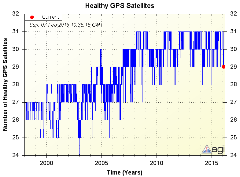 Mai jos o imagine ilustrativa a stabilitatii sistemului GPS in ultimii 15 ani, produsa de compania americana AGI. GPS are in acest moment 29 de sateliti in stare de functionare: