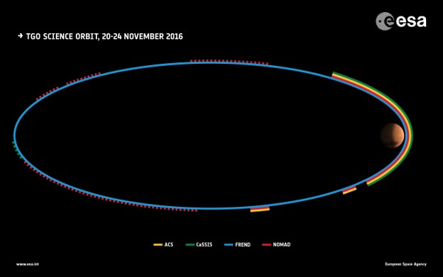 TGO zboara astazi in jurul lui Marte intr-o orbita eliptica cu excentricitate mare. Perioada orbitala de 4.2 zile muta satelitul de la 230-310 km in punctul inferior al traiectoriei, la aproximativ 98000 km altitudine in punctul superior. Anul viitor, dupa o serie de manevre orbitale, traiectoria va fi circularizata la o inaltime de aproximativ 400 km deasupra solului martian.