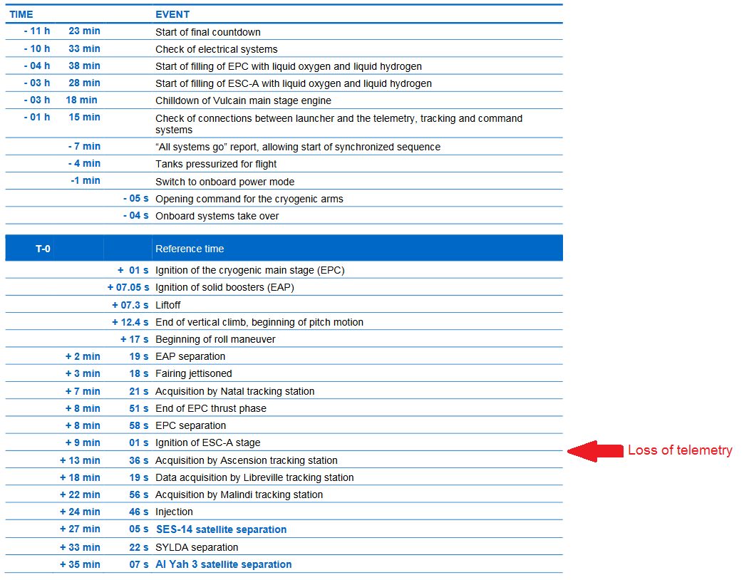 Am avut o plecare normala de pe rampa a rachetei Ariane 5, la ora 22:20 GMT, cu un zbor care ar fi trebuit sa dureze 35 de minute si 7 secunde (misiunea principala), urmata mai tarziu de deorbitarea treptei superioare ESC.