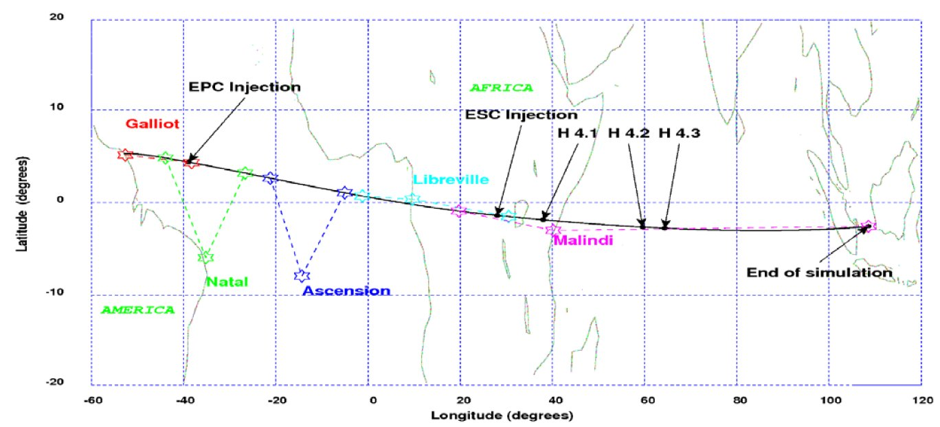 Dupa parasirea rampei, racheta a fost urmarita independent de statia de sol Kourou (telemetrie) si de autoritatea pentru siguranta zborului (radar) in ascensiunea sa catre orbita. In mod normal Arianespace foloseste o retea de statii de sol distribuite, sa cum se vede in imagine, pe traiectoria de lansare pentru a prelua date de la sistemul de telemetrie al rachetei (in paranteza trebuie spus ca aceasta este singura care furnizeaza date, satelitii fiind opriti pana la separare).