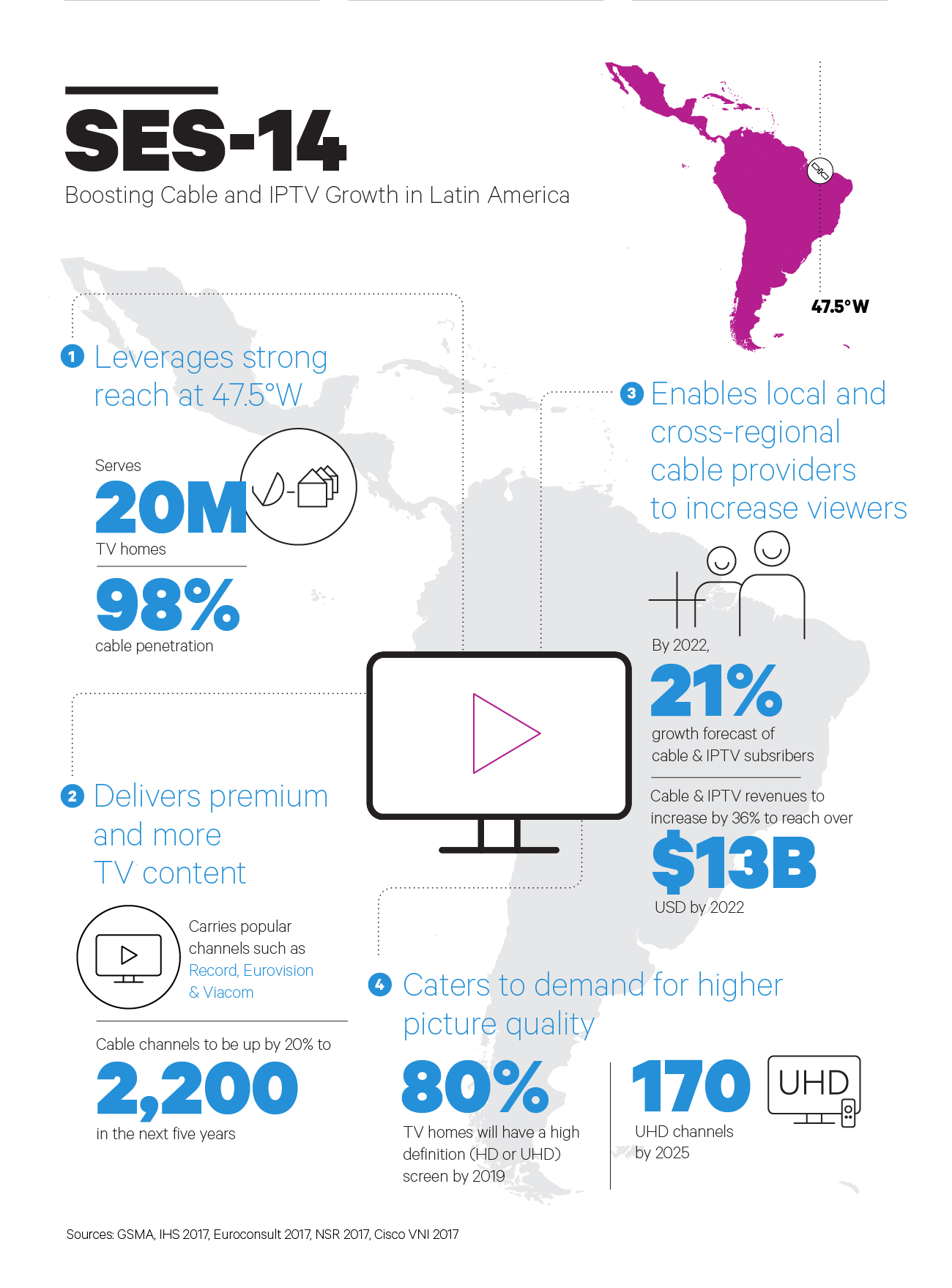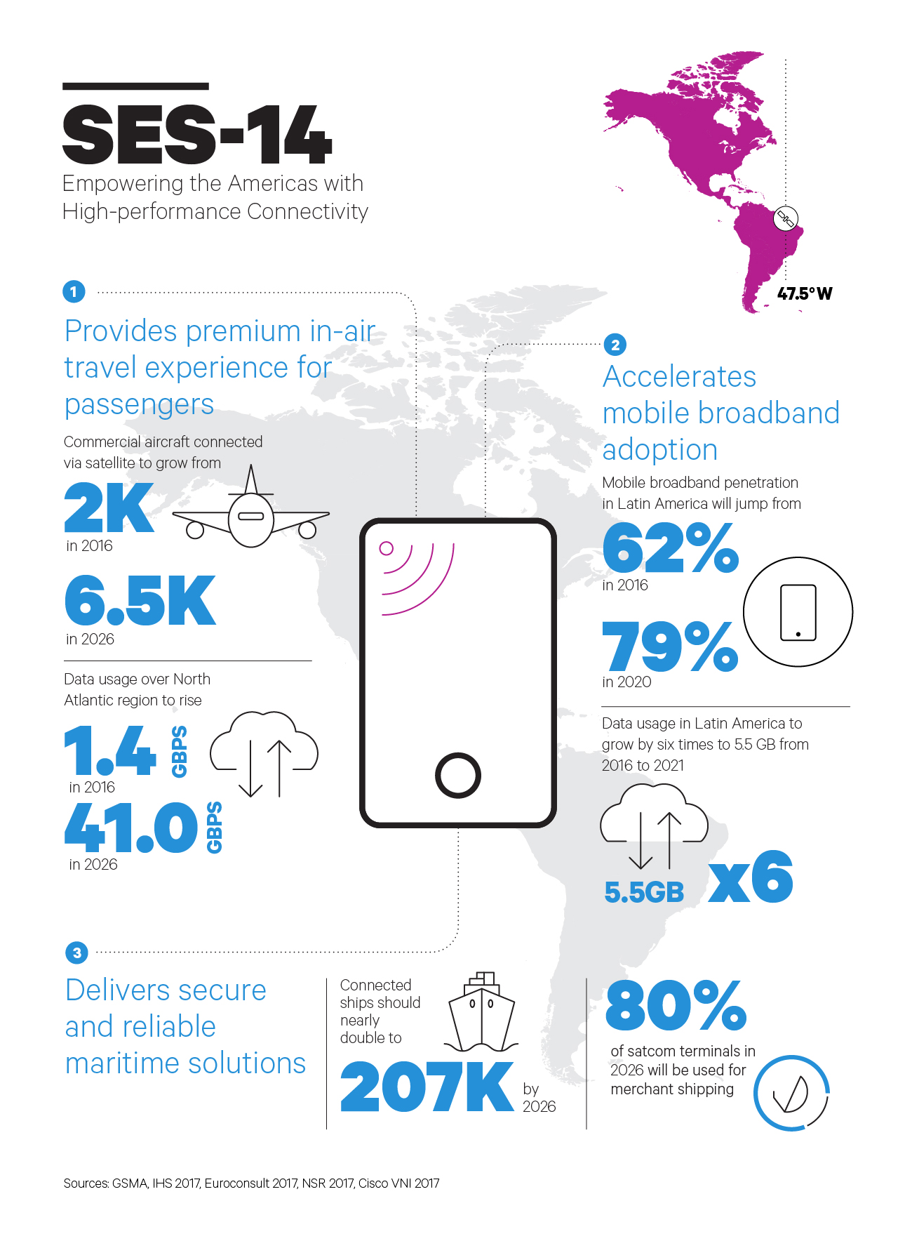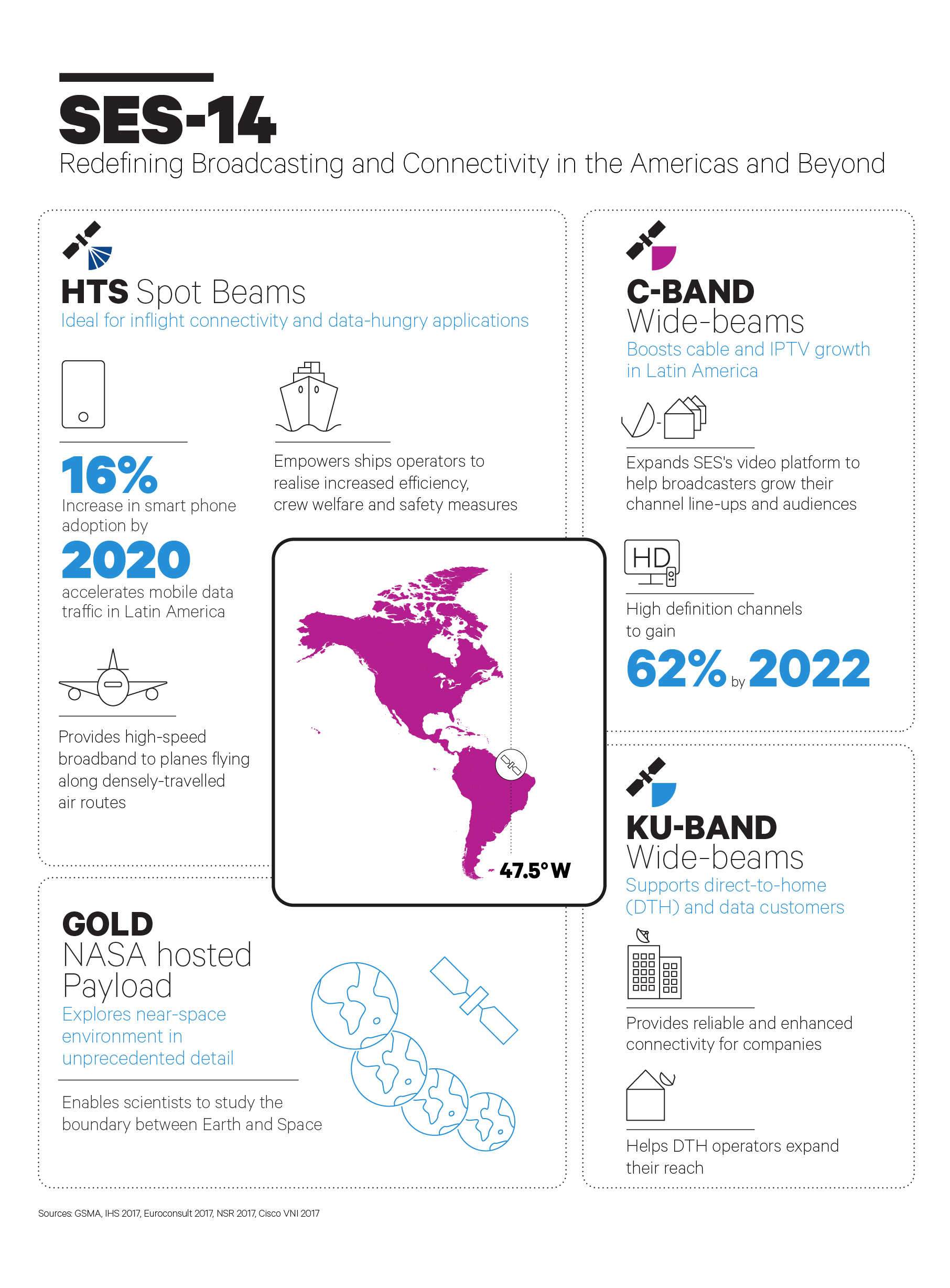 SES 14 este destinat pozitiei orbitale 47.5 grade longitudine vestica, acolo unde ar trebui sa inlocuiasca satelitul NSS 806 ce se afla in spatiu din 1998. El va deservi cele doua Americi, Caraibele si regiunea nord-atlantica.