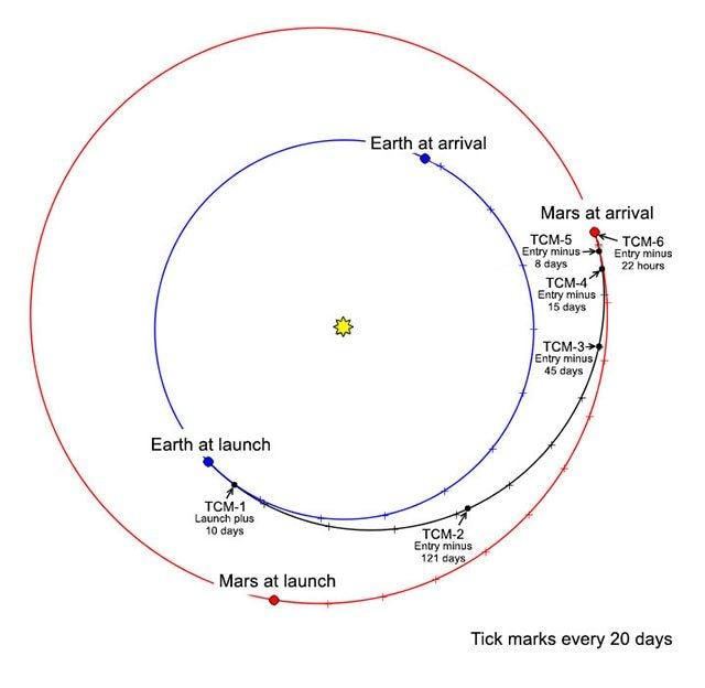 Pe 22 mai, o saptamana mai tarziu decat era in planul initial, InSight, realiza prima manevra orbitala: cele 4 motoare mari de la bord au fost pornite timp de 40 de secunde, suficient pentru a schimba viteza satelitului cu 3.8 m/s.