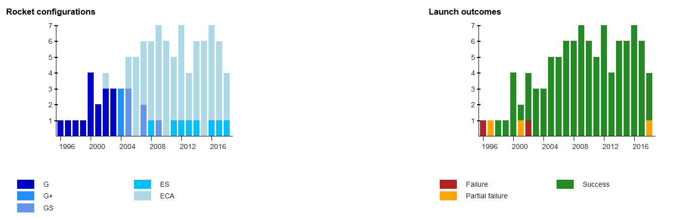 Profilul cel mai obisnuit de zbor, GTO, a fost deservit in majoritate de versiunea ECA (62 de zboruri), a carei record de greutate neta transportata a ajuns la 9969 kg (din iunie 2017 cu ViaSat 2 si Eutelsat 172B la bord). Din cei 207 sateliti transportati, 170 au zburat in GTO (153 fiind sateliti telecom).