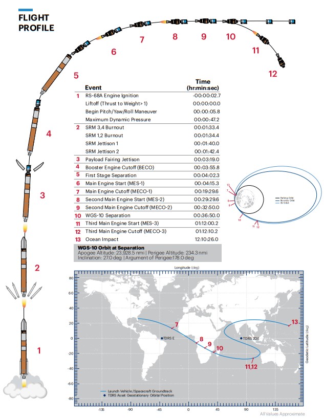 Racheta Delta 4, in versiune Medium+ 5,4 (Medium+ aflata la penultima sa misiune in flota ULA, 5,4 la ultima sa misiune), s-a achitat cu succes de sarcina incredintata si a trimis pasagerul WGS 10, dupa 36 de minute de abor, intr-o orbita super sincrona.