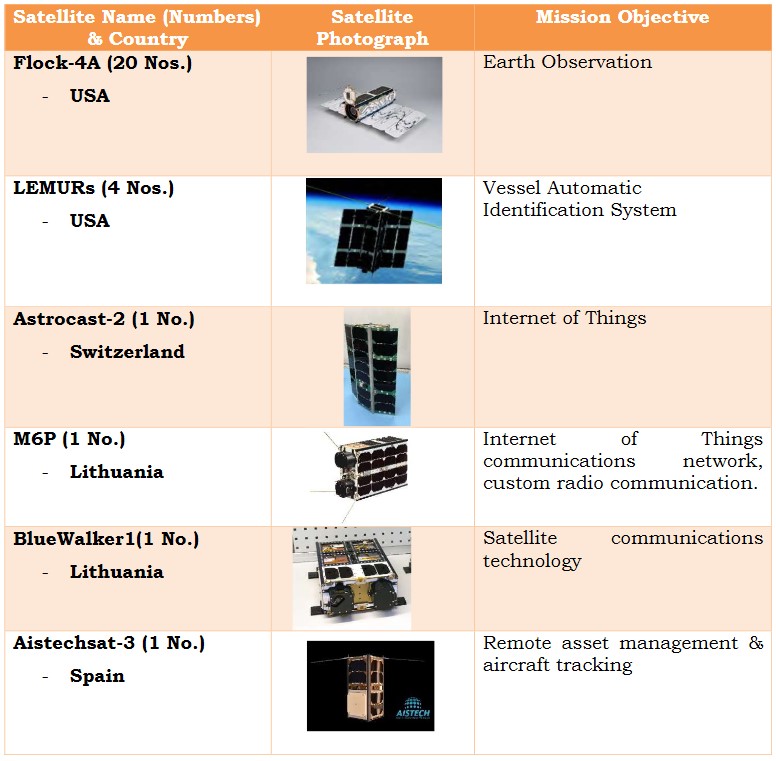 Ceilalti pasageri, sunt 28 de sateliti Cubesat, de diferite marimi (2U, 3U, 6U) provenind din SUA (24), Elvetia (1), Lituania (2) si Spania (1). De altfel PSLV este una din rachetele preferate pentru astfel de misiuni, indienii oferind de multi ani, diversilor operatori internationali, restul capacitatii ramase libere la bordul rachetei lor.