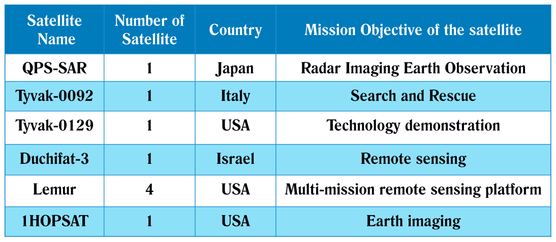 Ceilalti 9 sateliti sunt QPS-SAR, Tyvak 0092 si 0129, Duchifat 3, Lemur 2 108, 109, 110 si 111 si respectiv Hopsat.