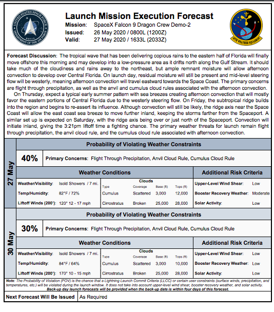 Fereastra de lansare se va deschide la 20:33 GMT, miercuri 27 mai, cu a doua optiune pentru sambata 30 mai la ora 19:22 si o a treia optiune pentru duminica, 31 mai, la 19:00 GMT.