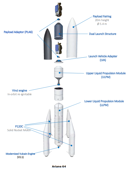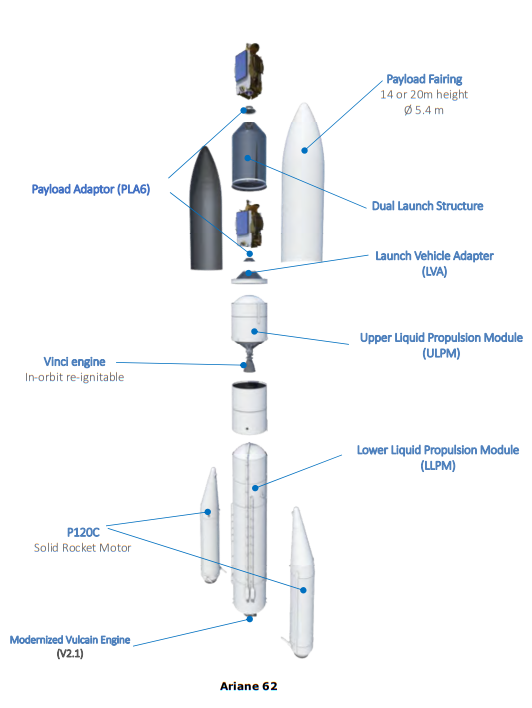 Ariane 6, momentan in configuratia Block 1, impartaseste in mare parte aceeasi constructie intre variantele 62 si 64: un motor Vulcain pentru treapta intai si un motor Vinci pentru treapta a doua, acesta din urma restartabil. Ambele folosesc hidrogen si oxigen lichid.